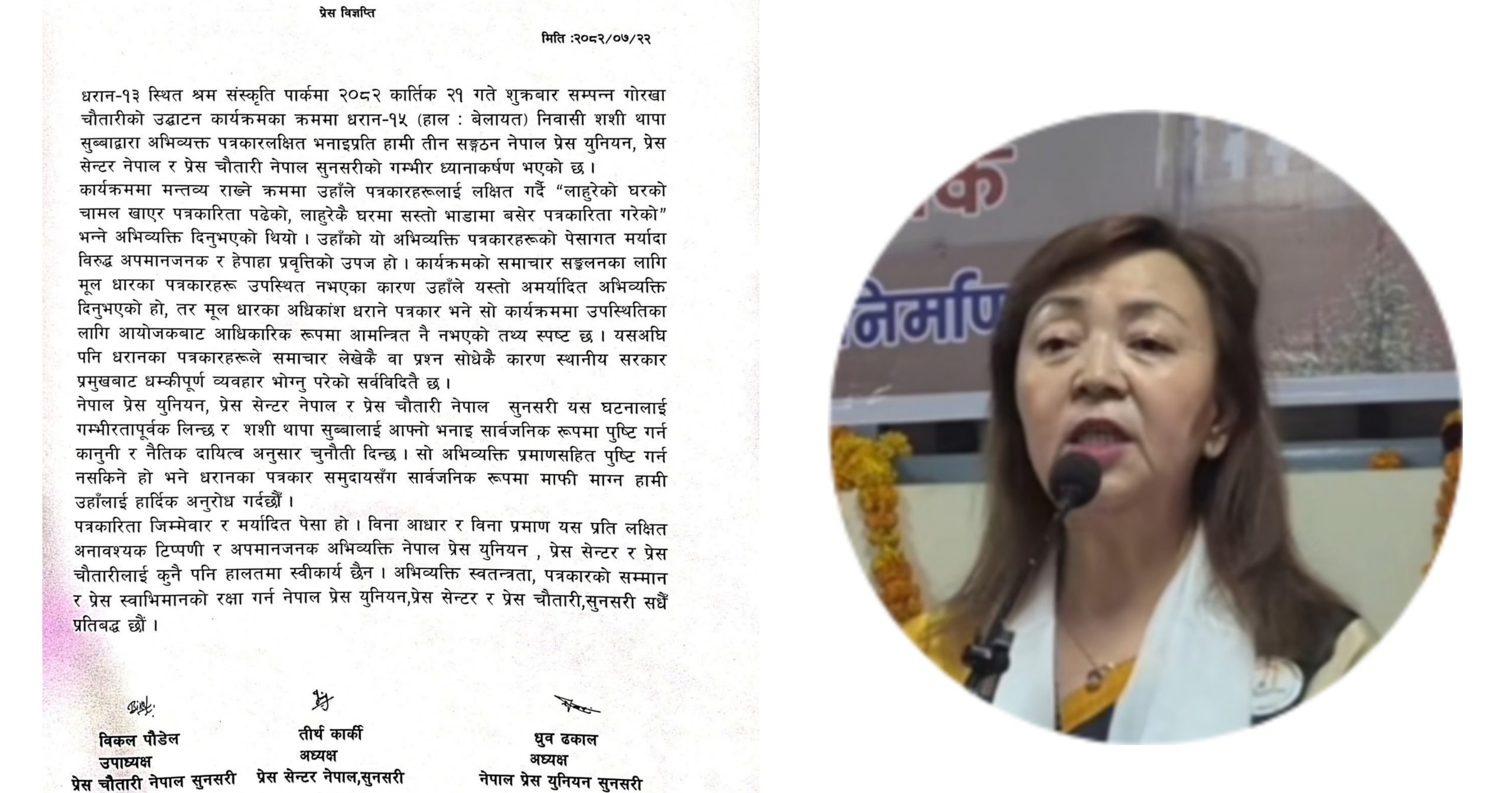 धरान : धरान–१३ स्थित श्रम संस्कृति पार्कमा शुक्रबार उद्घाटन भएको गोर्खा चौतारीको कार्यक्रमा हाल बेलायत बसोबास गर्ने शशी थापा सुब्बाद्वारा पत्रकारहरूलाई लक्षित गरी गरि दिएको अभिव्यक्तिप्रति ३ पत्रकारजन्य पेशागत संगठनहरूले गम्भीर आपत्ति जनाएका छन्।