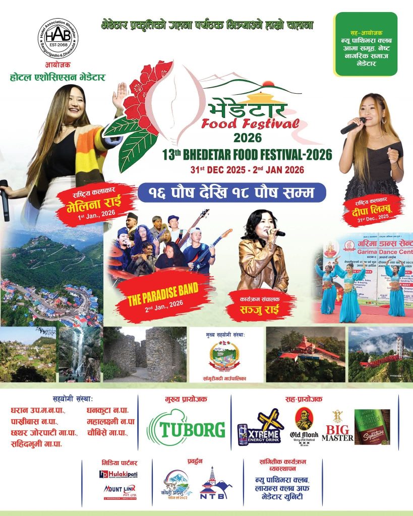 धरान: भारतीय पर्यटकलाई भेडेटार तथा आसपासका गन्तव्यस्थलप्रति आकर्षित गर्दै त्यस क्षेत्रको रहनसहन, भाषाशैली र सांस्कृतिक विविधताबारे जानकारी गराउने उद्देश्यले आयोजना गरिएको तीनदिने खाना महोत्सवको उद्घाटनकै दिन उल्लेख्य संख्यामा भारतीय पर्यटकको आगमन भएको छ । अंग्रेजी नयाँ वर्षलाई लक्षित गरी पुस १६ देखि १८ गतेसम्म आयोजना गरिएको १३औँ भेडेटार फुड फेस्टिभलको पहिलो दिनमै भारतीय पर्यटकको उपस्थिति बाक्लिएको हो ।