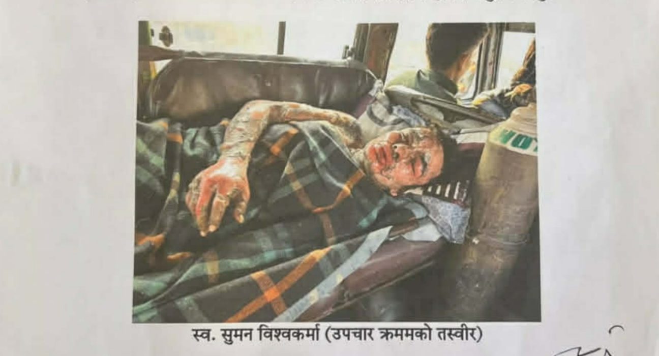 समाजका अध्यक्ष युवराज शंकरका अनुसार विश्वकर्मा पुस १० गते सुतिरेहको मैनवत्तिबाट आगो सल्केर भएको आगलागीमा परी गम्भिर घाइते भएका थिए ।