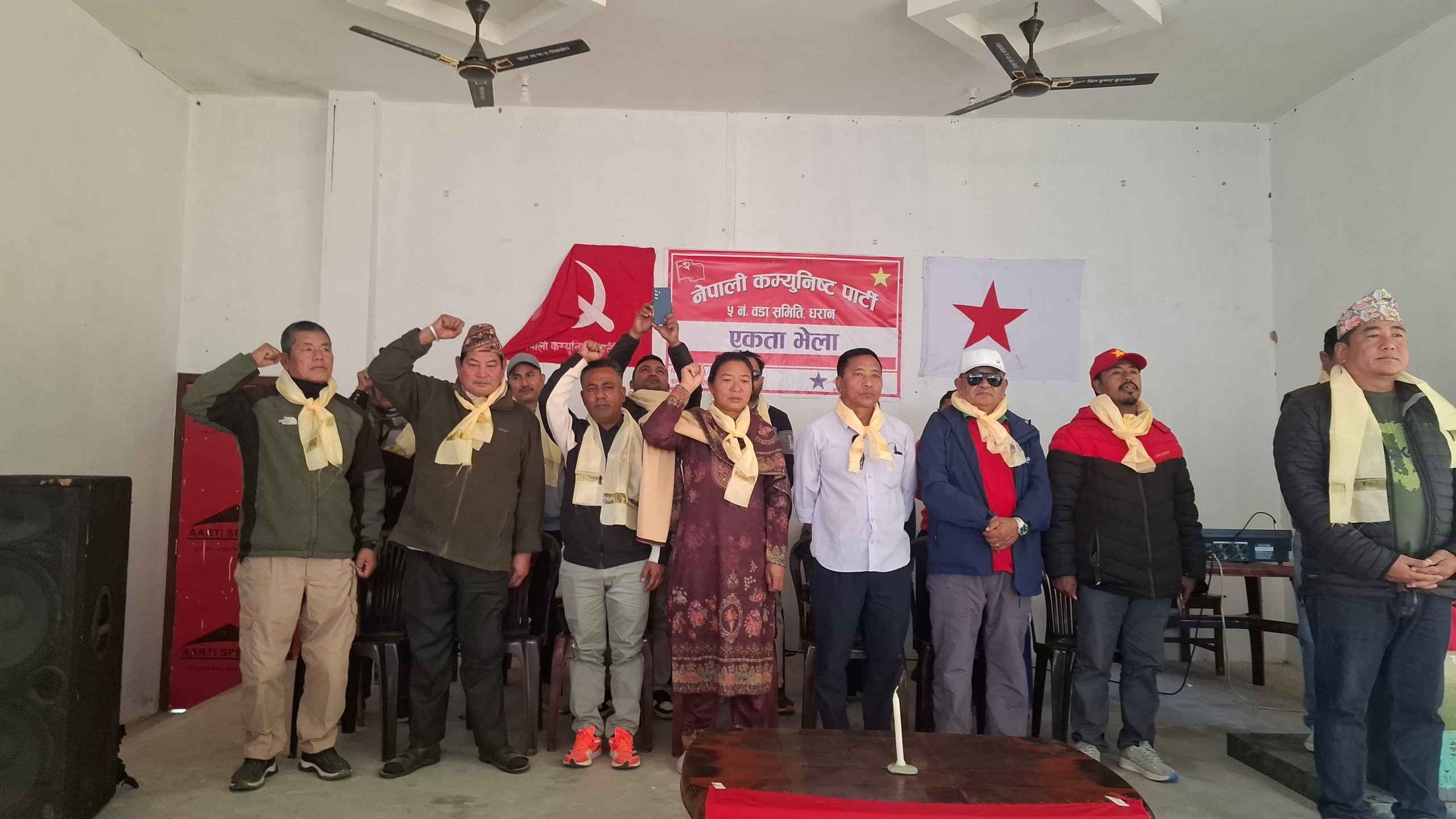 धरान: नेपाली कम्युनिष्ट पार्टी धरान ५ को एकता भेला शुक्रबार सम्पन्न भएको छ । एकता भेला साविक नेकपा माओवादी केन्द्र वडा नम्वर ५ का निवर्तमान अध्यक्ष धनकुमार राईको अध्यक्षता र नेपाली कम्युनिष्ट पार्टी केन्द्रीय सदस्य टीका कन्दङवा रेखाको प्रमुख आतिथ्यतामा सम्पन्न भएको हो ।