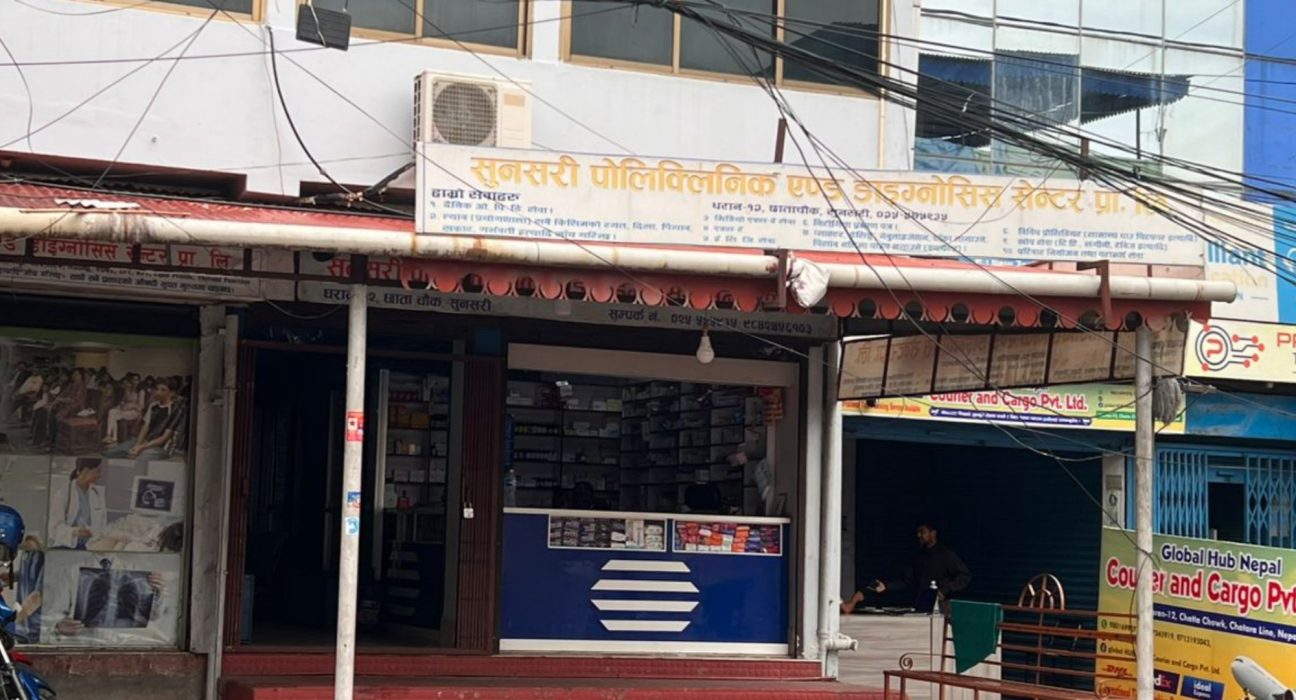 यस्तो अवस्थाले सजिलो मानेर उपचार गराउन क्लिनिकमा जाने सर्वसाधारणको स्वास्थ्योपचार जोखिममा पर्न सक्ने स्थिति धरान जस्तो शहरमा पनि विद्यमान छ । धरान–१२ स्थित सुनसरी पोलिक्लिनिक एण्ड डाइग्नोसिस सेन्टर प्रालि सञ्चालनको व्यवस्था त्यस्तो देखिएको छ ।