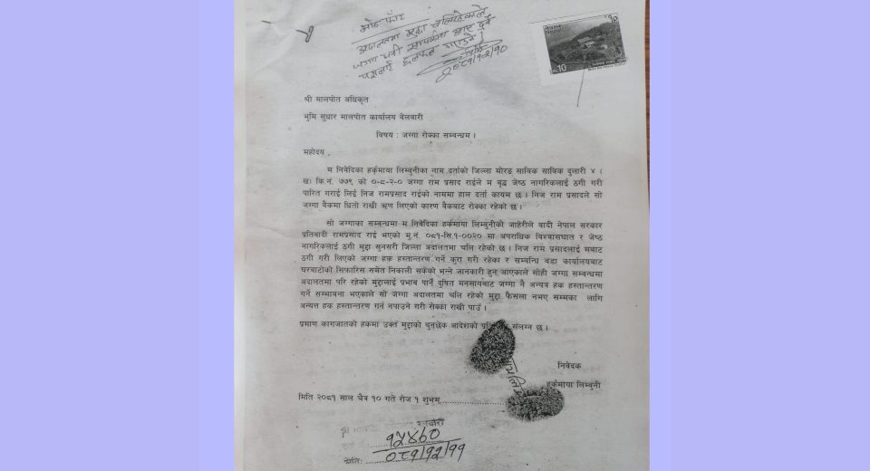धरान १६ का रामप्रसाद राईले किर्ते गरी जग्गा आफ्नो नाममा पारेको भनि पीडितले जिल्ला अदालत सुनसरीमा मुद्धा हाले पनि जालझेल गरेर विक्री गर्न खोजेको भन्दै पीडित परिवारले सम्बन्धित निकायमा गुहार मागेका छन् । राईले धरान उपमहानगरपालिका वडा नं. १५ एभरेष्ट लाइनकी ७२ बर्षीया हर्कमाया लिम्बुको मोरङ जिल्लाको सुन्दर हरैचा दुलारीमा रहेका ८ कट्ठा २ धुर […]